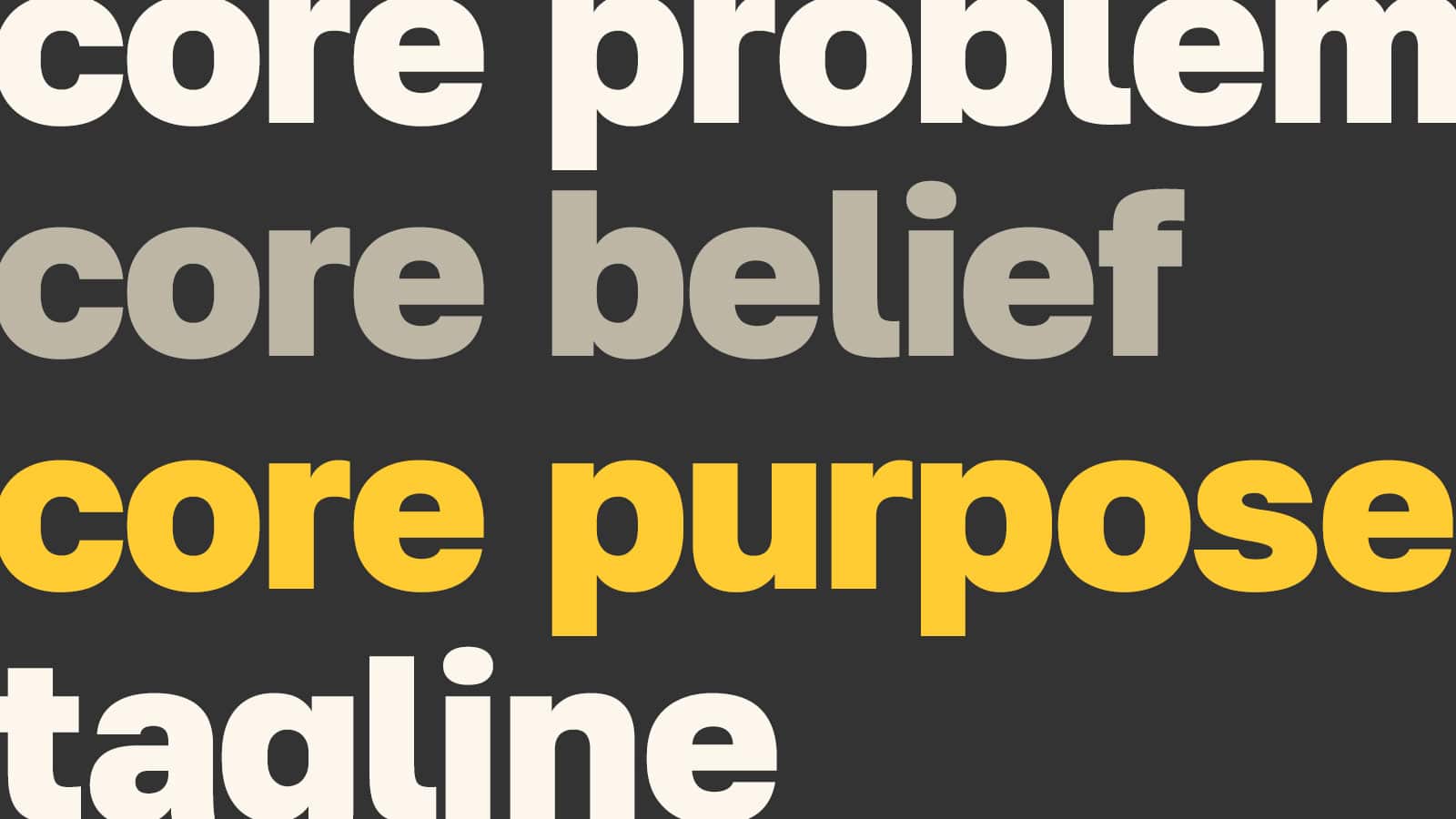 We develop four key messaging components to ensure that your purpose is compelling to all of your audiences: Core Problem, Core Belief, Core Purpose, and Tagline.